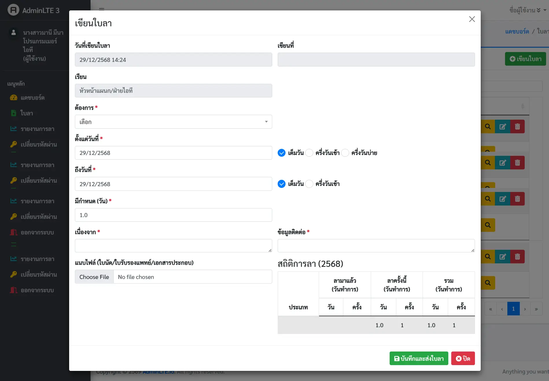 -สามารถเรียกดูรายงานสถิติการการยื่คำขอลาได้