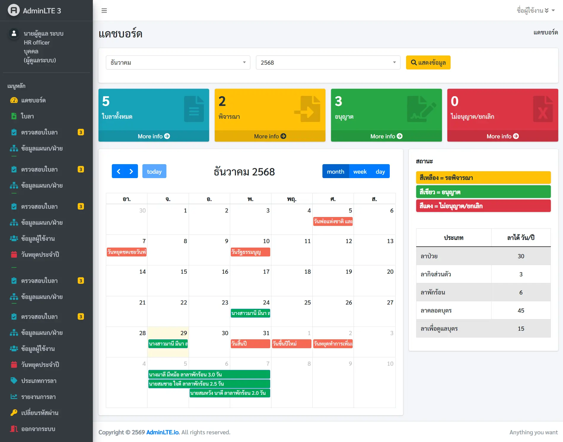 - ในการลาแต่ละประเภทสามารถระบุจำนวนวันที่ลาต่อปีได้ หากเกินจำนวนระบบจะแจ้งเตือน แต่ก็ยังสามารถบันทึกข้อมูลการลาได้