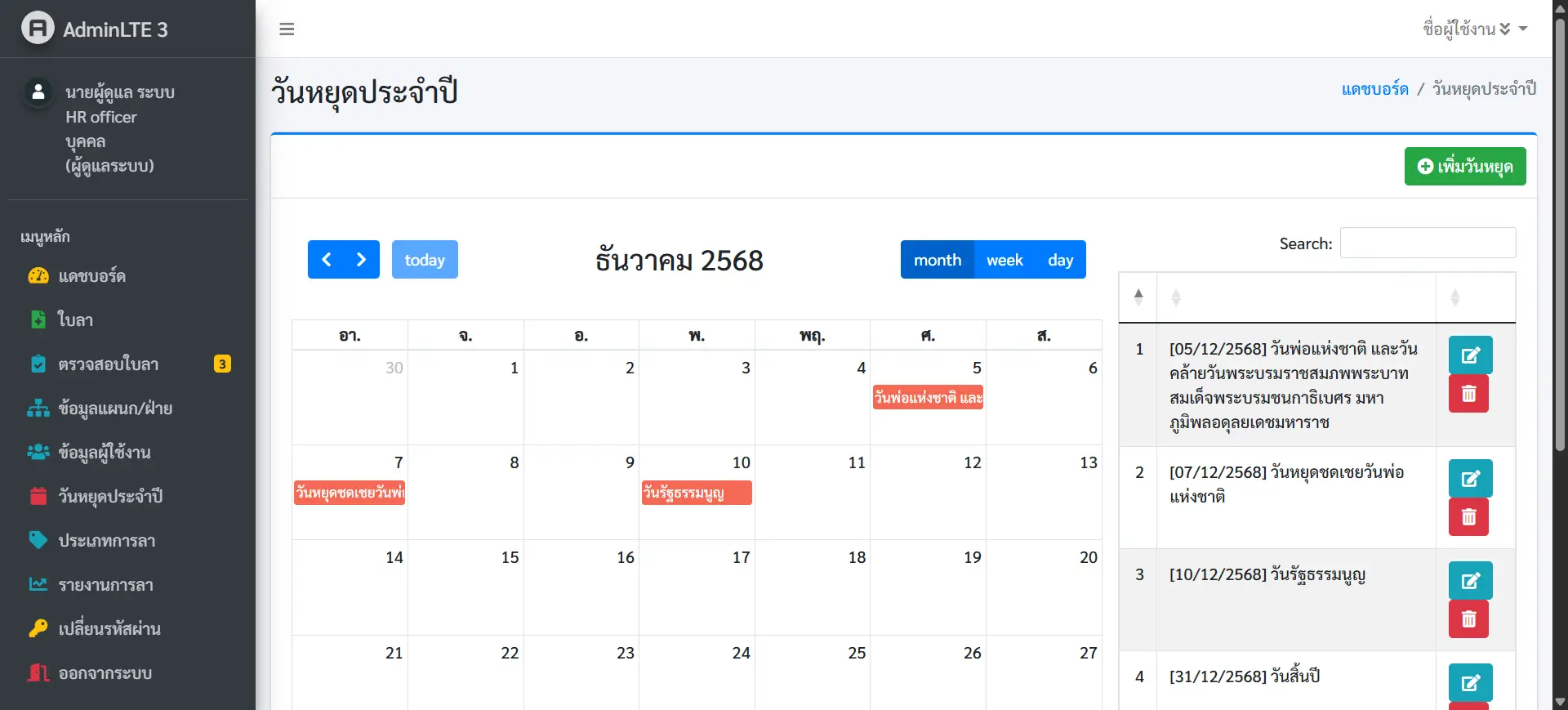 - สามารถเพิ่ม แก้ไข ลบ ค้นหาข้อมูลวันหยุดประจำปีได้